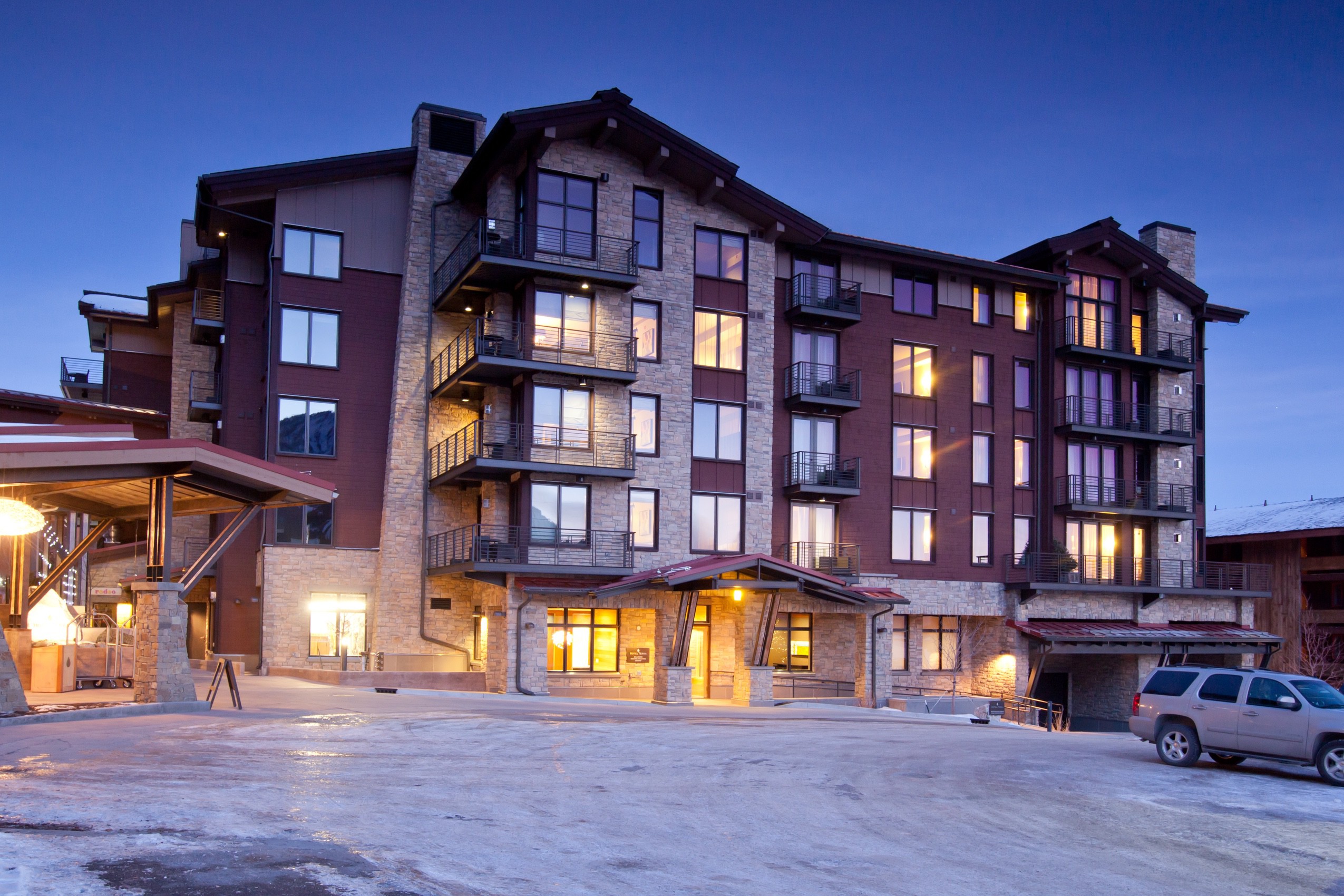 Hotel Terra is a 54,171-sf, wood-frame, boutique luxury. Rooms range from traditional hotel rooms to one, two, and three-bedroom suites equipped with kitchens and gas fireplaces. Construction included convention and meeting facilities, an upscale restaurant, a lobby lounge with a cafe, 3,000-sf of retail space, a fitness center, a pool and a full-service spa, a three employee housing units. Additional amenities include upscale and natural finishes, high ceilings, oversized windows, double vanities, heated bathroom floors, and deep soaking Zuma air-tubs in certain suites.