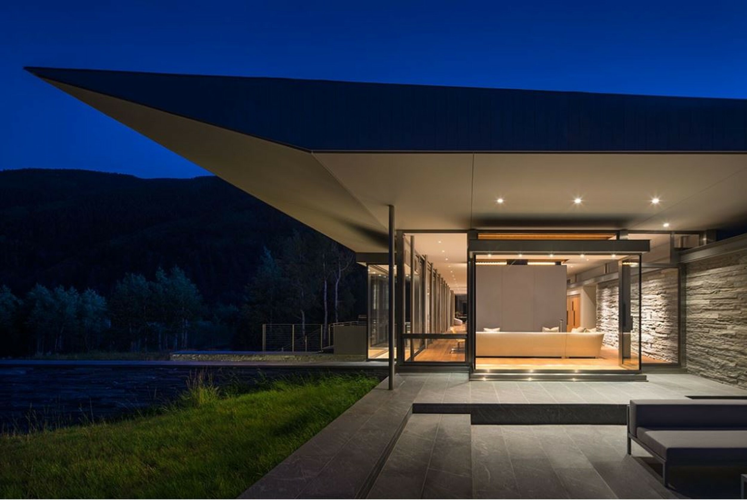 The Independence Pass Residence is situated at the edge of a nature preserve in Aspen and has views of an alpine meadow, forests of evergreen and aspen trees, the Roaring Fork River and the Rocky Mountains. This residence is constructed with a Canopy style structure with a roof assembly floating over a glass façade. The custom home features a contemporary interior. Finishes include stone veneer, SS Italian windows, old-growth Douglas fir woodwork, a cantilevered wood and a glass stairway. A second stairway connecting all levels of the house is crafted of a one-inch thick steel plate that is both structure and guardrail, slicing through the vertical space.