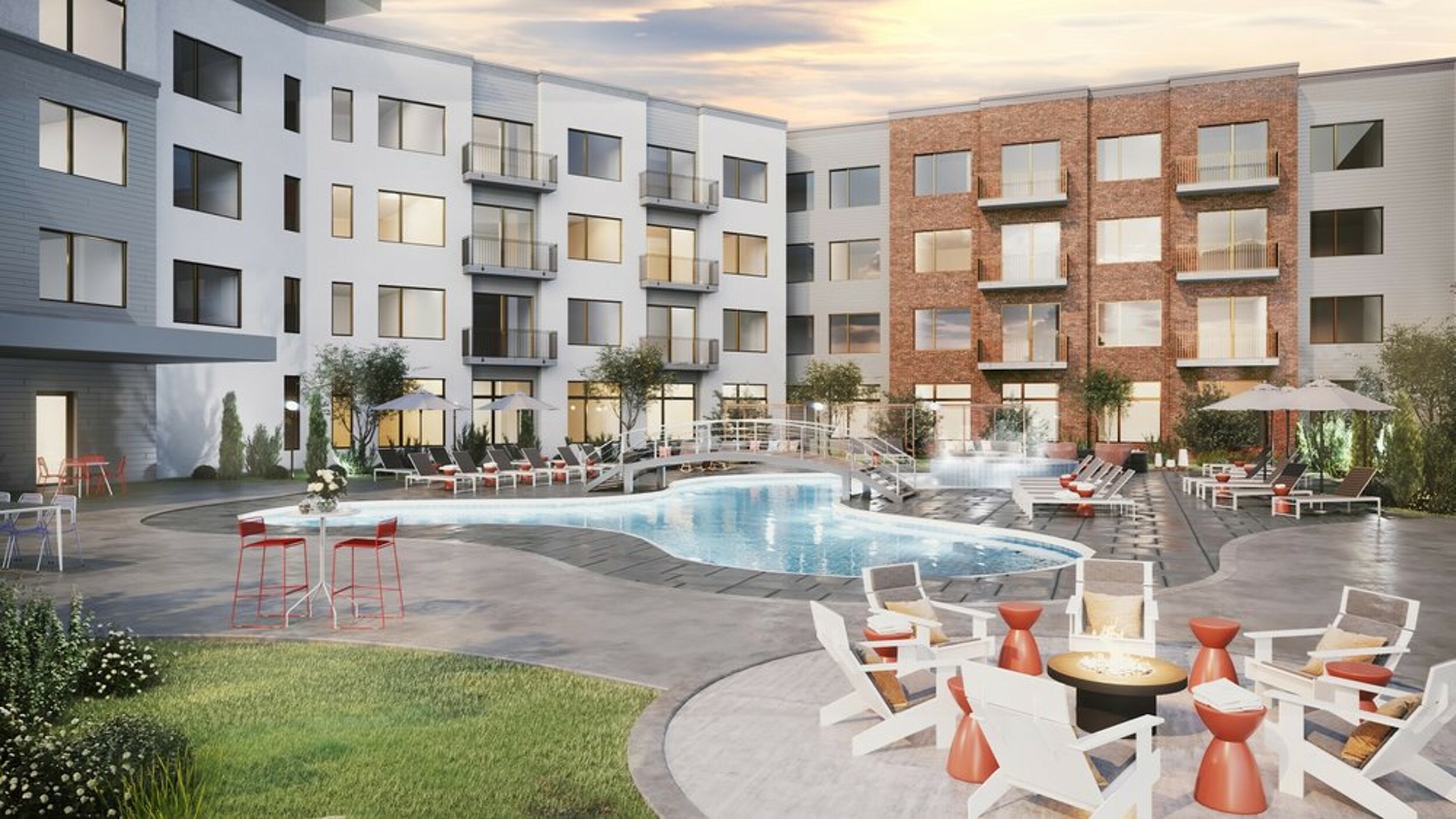finishes include stucco, brick, siding, and metal cladding. Amenities include a fitness area, a bike repair center and storage area, a full-service dog wash, a roof deck with a fire pit and BBQ grill, and numerous community spaces.